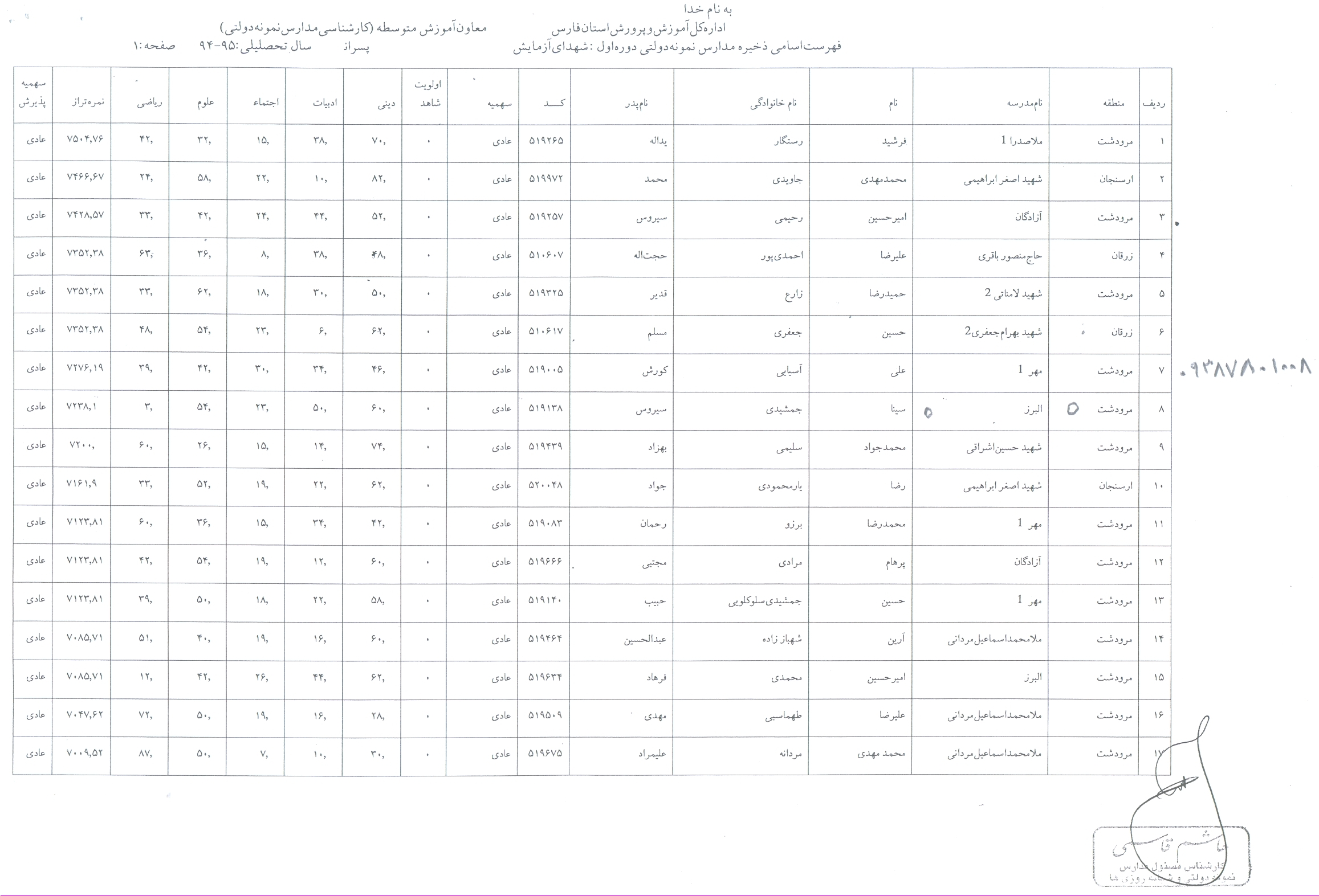 اسامی دانش آموزان پذیرفته شده آموزشگاه نمونه دولتی شهدای آزمایش مرودشت سال تحصیلی 95-94